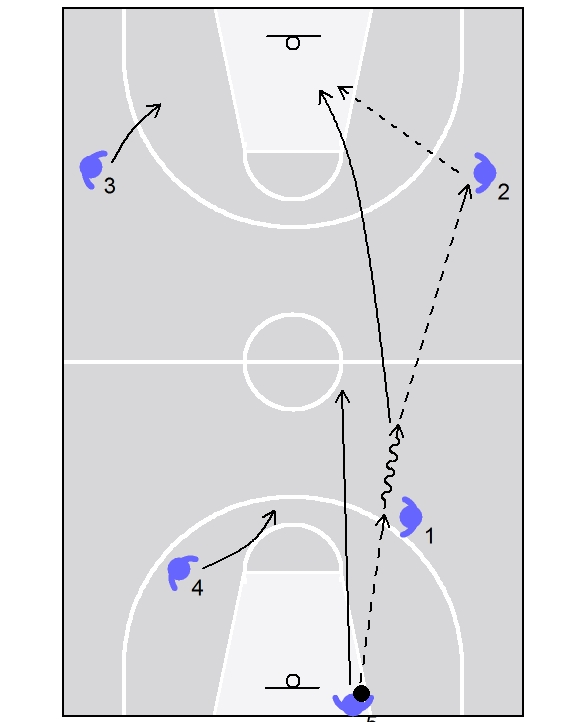 Note: 2 can receive the ball at any time when sprinting up the sideline. He will then just dribble up to attack the defense off the dribble. If he can’t get to the rim he will pull back and look for the next options.